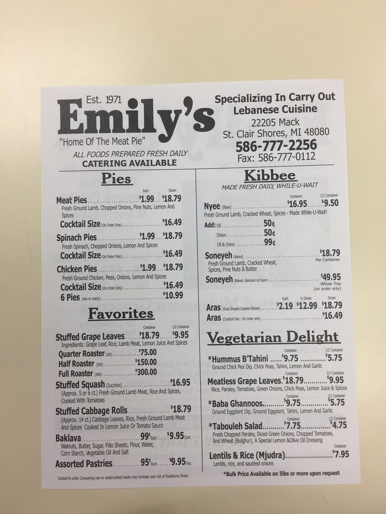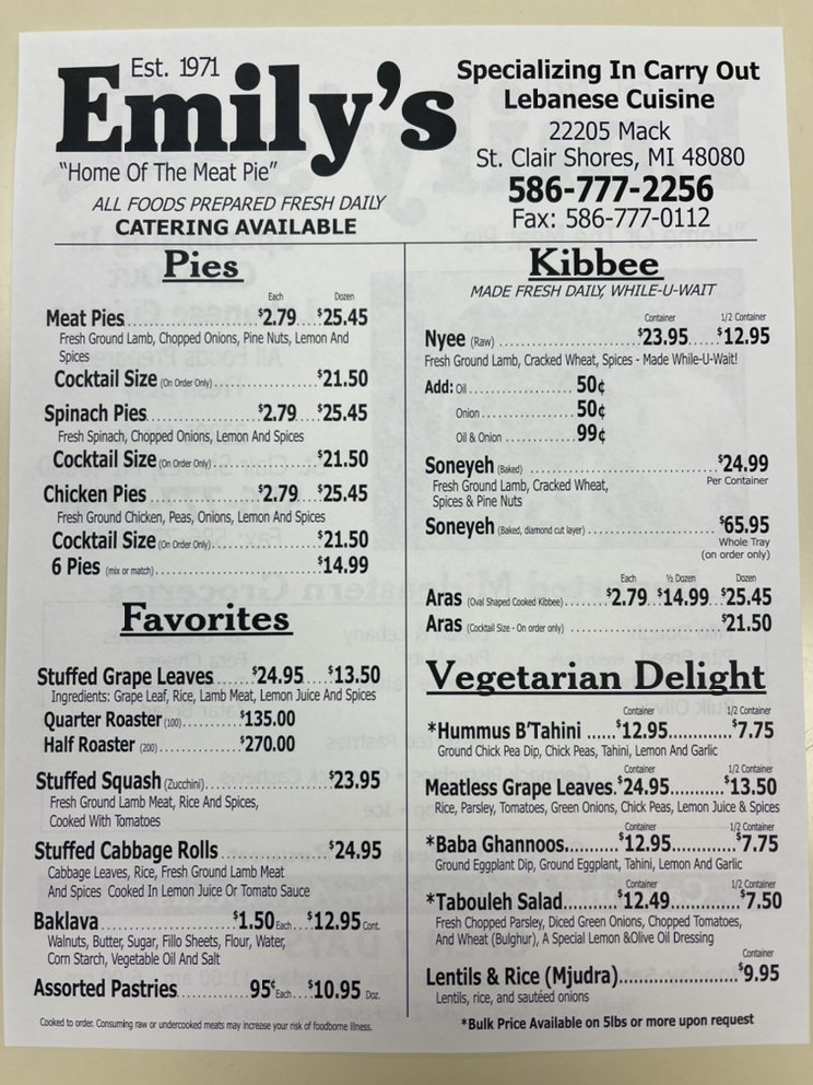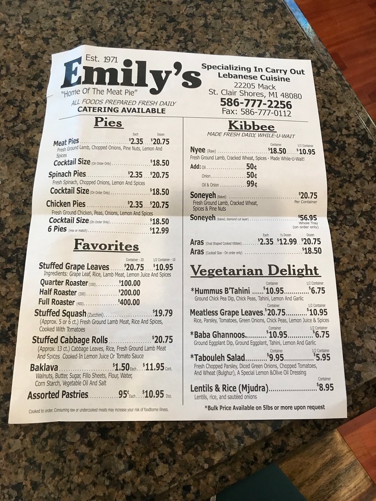 Located in Saint Clair Shores, MI, Emily's Delicatessen offers a wide range of Middle Eastern dishes with a focus on traditional flavors and quality ingredients. The menu features a variety of pies, including savory options like meat pie, spinach pie, and chicken pie, as well as favorites like stuffed grape leaves and stuffed squash. Customers rave about the kibbee options, especially the raw kibbee and baked soneyeh. The reviews highlight the friendly service, delicious meat pies, and the authentic Lebanese cuisine that Emily's Delicatessen is known for. With a casual atmosphere and accommodating staff, this family-run business has been a favorite spot for locals and visitors alike for over 25 years. Whether you're craving comfort food or looking to try something new, Emily's Delicatessen is a must-visit destination for Middle Eastern cuisine enthusiasts.